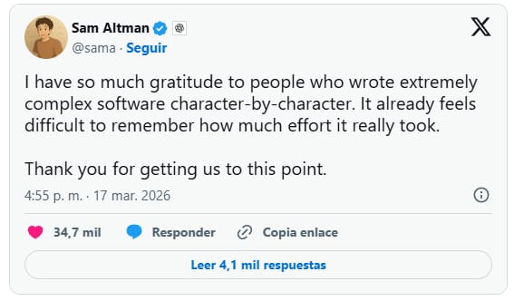 Sam Altman acaba de firmar el acta de defunción de la programación tradicional con un tuit teñido de nostalgia cínica. Mientras OpenAI se consolida, gigantes como Amazon, Meta y Block ejecutan despidos masivos para financiar la costosa infraestructura de la IA. Es el fin oficial del código escrito "carácter a carácter".